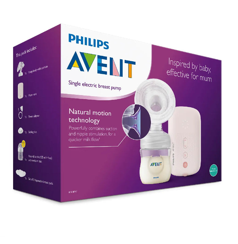 The Philips Avent Single Electric Breast Pump features innovative Natural Motion Technology that mimics a baby’s natural suckling rhythm, stimulating quicker milk flow in as little as one minute. Designed for comfort and efficiency, it boasts a soft, adaptive silicone cushion that fits 99.98% of nipple sizes (up to 30 mm), ensuring a secure and gentle latch. With 8 stimulation and 16 expression levels, you can personalize each session to match your preferences, while the memory function stores your optimal settings for next time. The pump’s closed expression system prevents milk from entering the tubing, making cleaning easier and maintaining hygiene. Its quiet motor enables discreet use anywhere, and its compact design supports comfortable, upright pumping—no leaning forward required. Included are minimal parts for intuitive assembly, a 125 ml feeding bottle, sealing disc, and more, all powered via a 5 V mains adapter (100–240 V input) and housed in a motor unit measuring 145 × 95 × 45 mm.